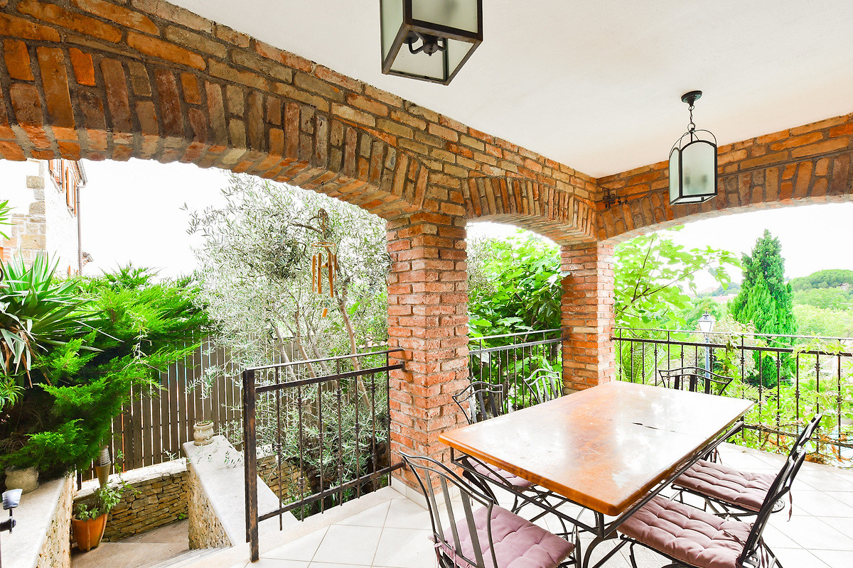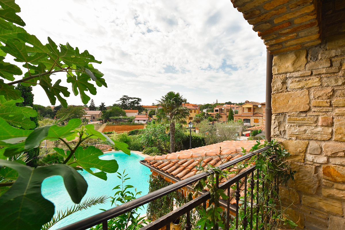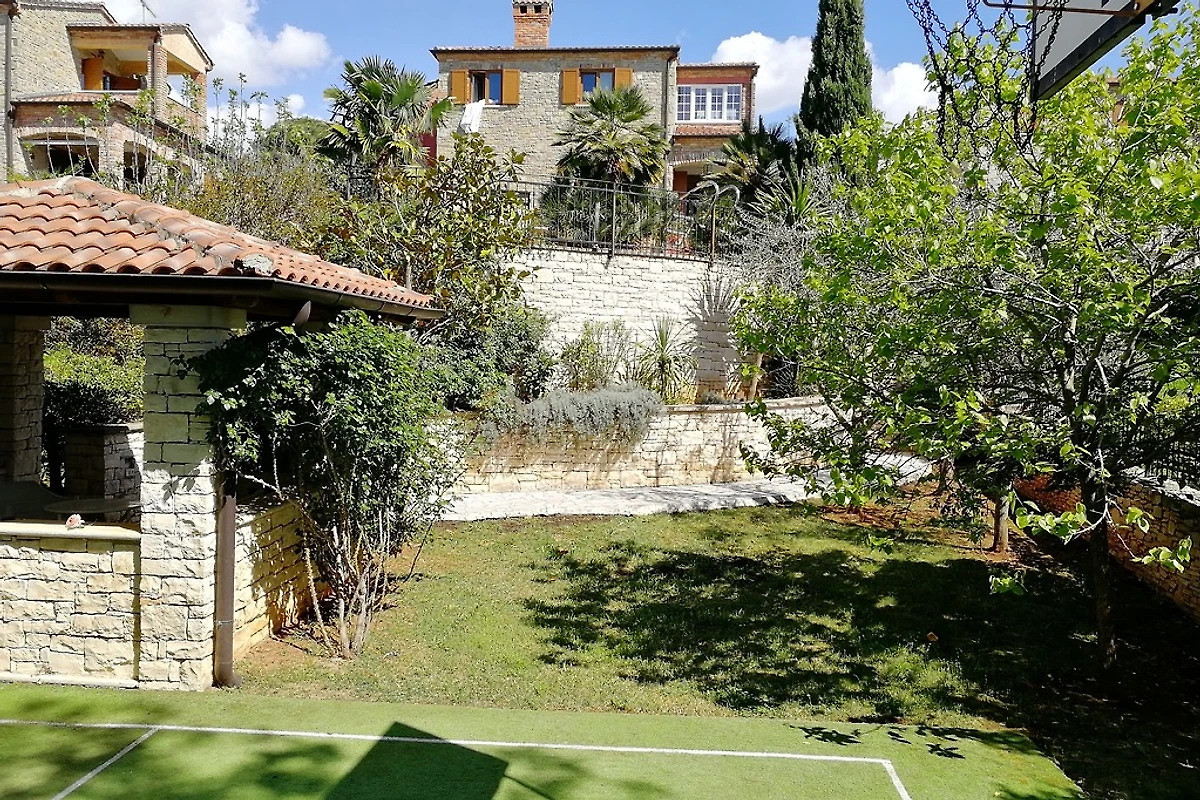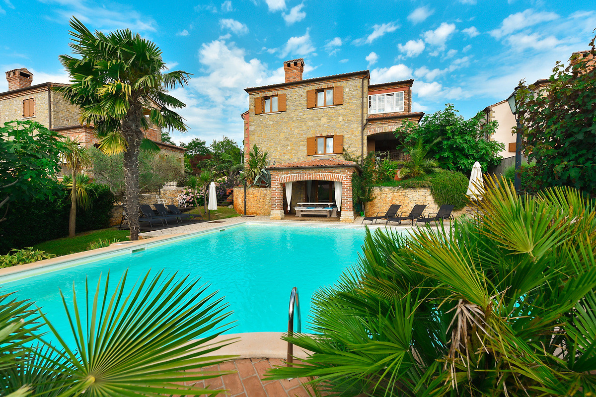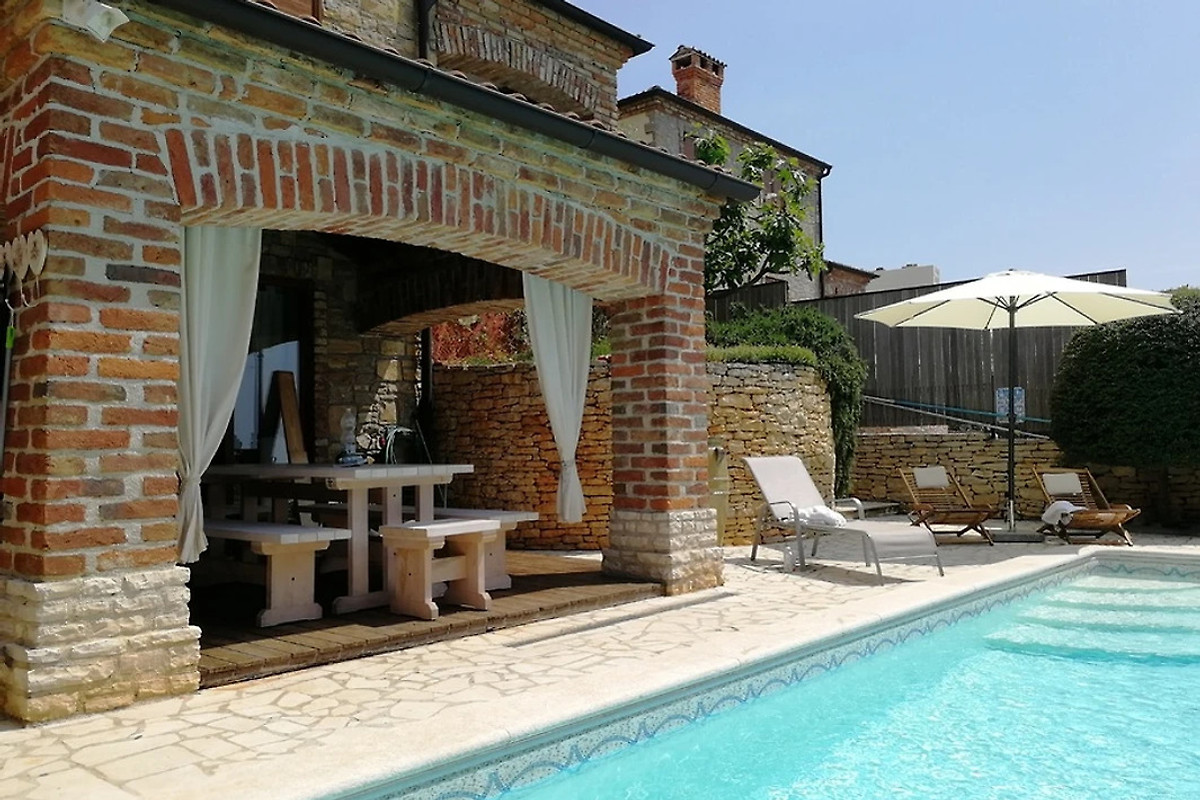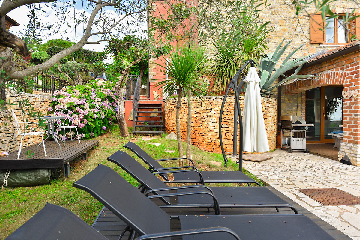 Das Herzstück der Villa: ein 12×8 m großer Pool mit Panoramablick auf das Meer und die istrische Landschaft. Sonnenliegen, Outdoor-Dusche und überdachter BBQ-Bereich laden zum Verweilen ein.